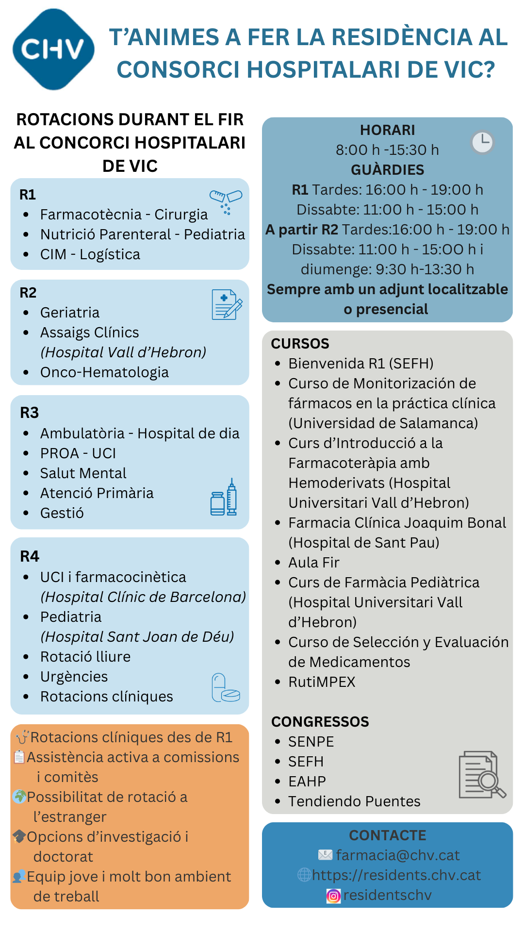 Los residentes de Farmacia Hospitalaria participan activamente en las diferentes áreas del Servicio de Farmacia del Hospital Universitario de Vic. Durante su formación se implican en actividades asistenciales, clínicas y técnicas relacionadas con el uso seguro y eficiente de los medicamentos en el ámbito hospitalario.